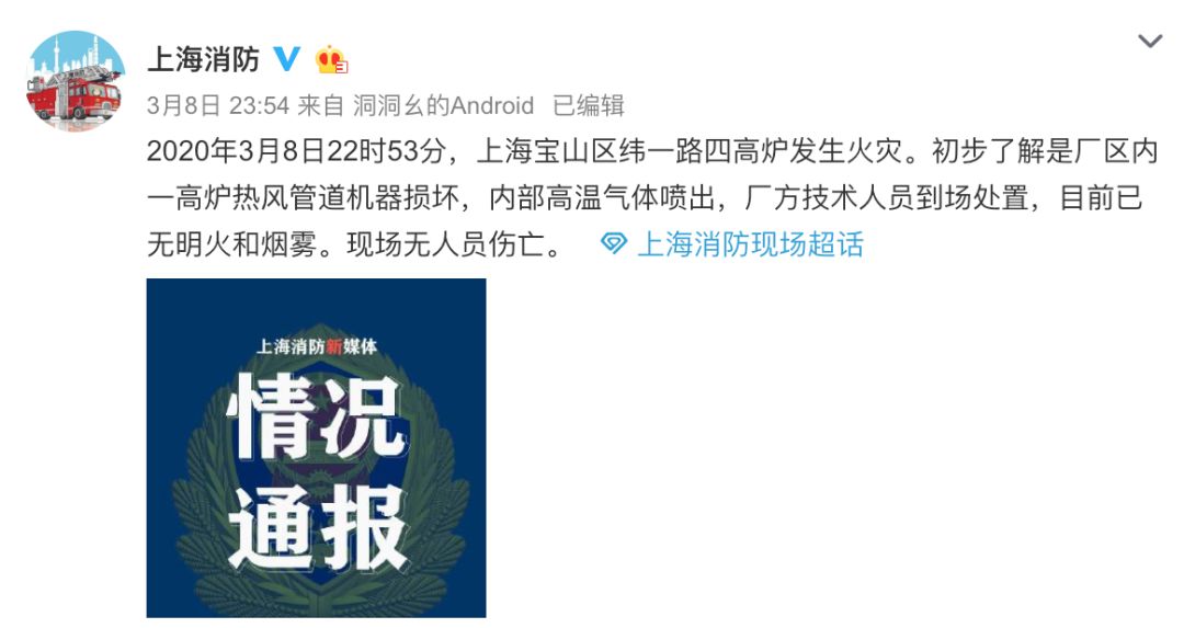 一波未平,一波又起。2020 年 3 月 8 日晚间,上海宝山区的宝钢工厂发生火灾,发出爆炸声响。
