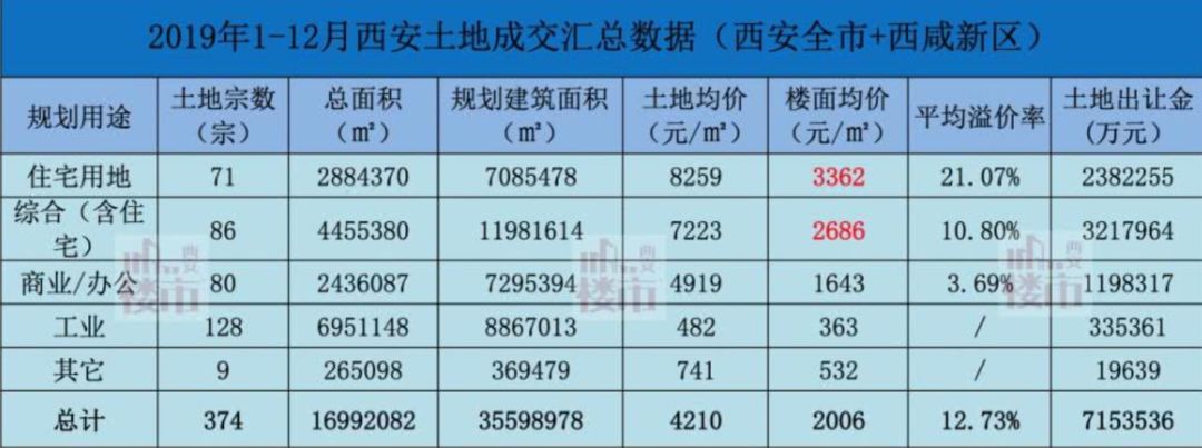 2019年,西安全市+西咸新区一共成交374宗土地,总金额约715亿元,其中住宅用地的平均楼面价,也环比上涨约12%,平均溢价21.7%。