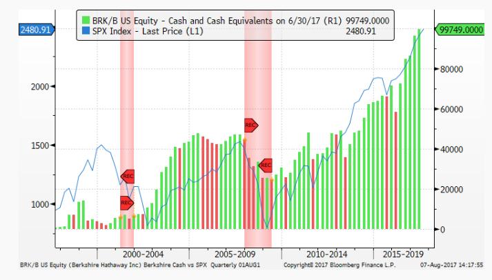 截至2019年年末,伯克希尔哈撒韦持有价值近1300亿美元的现金储备,这个数字占公司投资组合价值的一半以上。自1987年以来,这一比例唯一一次上升是在2008年金融危机之前的几年。