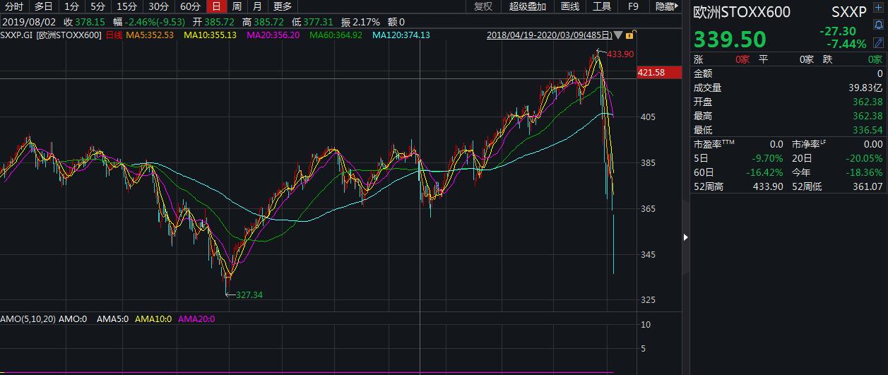 欧洲股市收市跌至近八个月最低水平,欧洲STOXX 600指数收跌7.44%,这也是2008年金融危机以来最差单日表现。