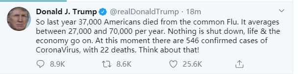 特朗普发推表示新冠疫情与流感相比“小巫见大巫”