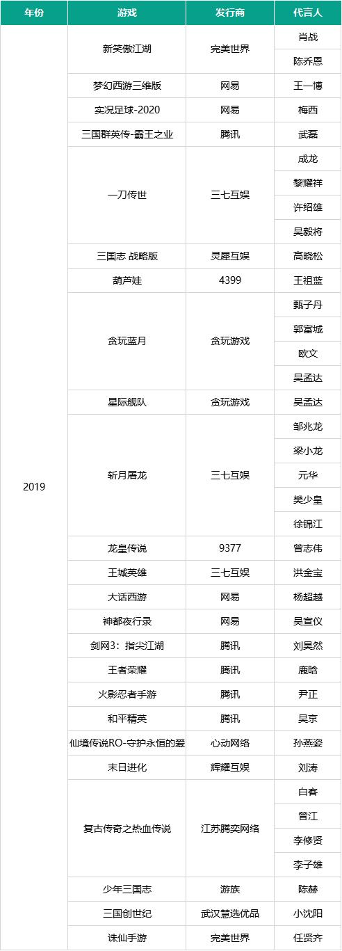 进入到2019年,完美世界《新笑傲江湖》邀请陈乔恩等作为代言人;网易《梦幻西游三维版》邀请了王一博、《大话西游》邀请了杨超越、《神都夜行录》邀请了吴宣仪;腾讯《剑网3:指尖江湖》邀请了刘昊然、《王者荣耀》邀请了鹿晗……这些成为代言人的明星,基本上都是近两年来大热的影视明星或流量偶像。