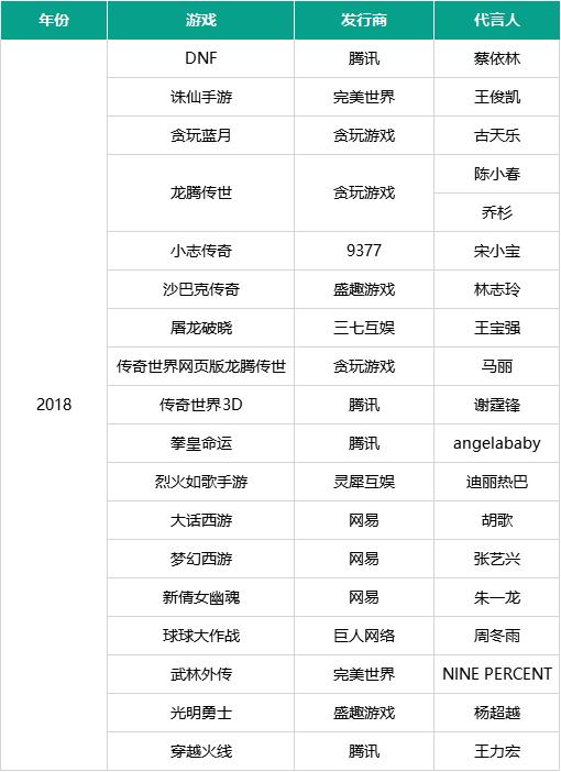据手游那点事不完全统计,2018年共有18款热度相对较高的游戏采用了明星代言人的买量打法,成为代言人的明星有19位。