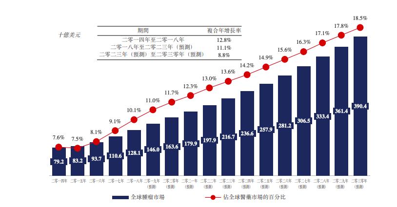 2014年-2023年,全球肿瘤药物市场规模历史及预测;图源自招股书;资料来源:弗若斯特沙利文分析