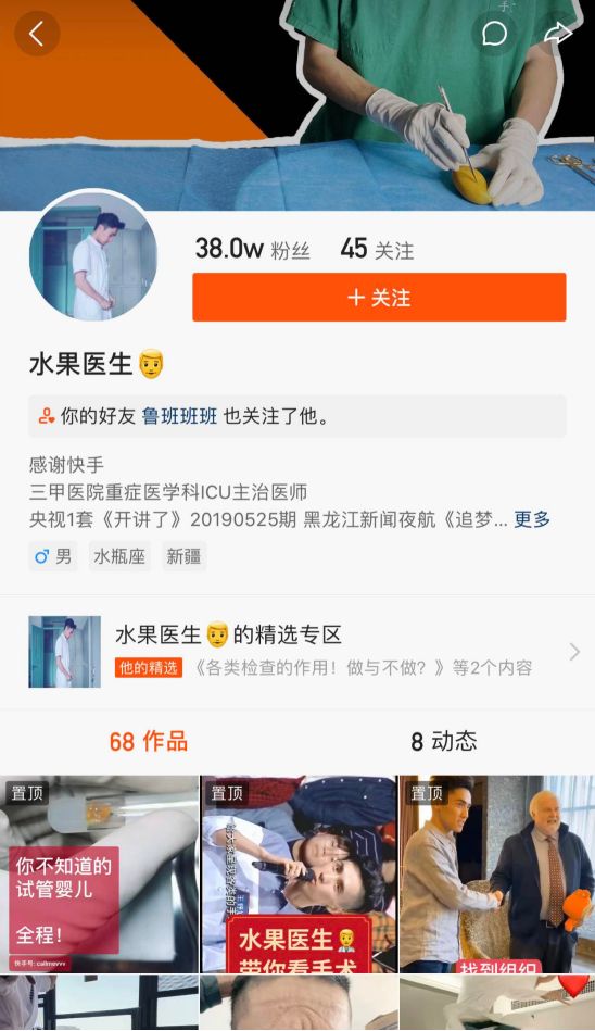 在这些扶持下,各大平台也孵化出一些优质的原生创作者,比如快手上的“水果医生”。通过给水果做手术的方式讲解一些手术流程和基础医学知识,这个三甲医院重症医学科主治医师利用业余时间拍视频,初衷是想让他儿子做医生,给儿子做展示,2018年9月发了第一期视频,反响很不错。