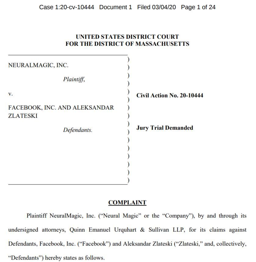 据外媒报道,在波士顿(马萨诸塞州)地方法院,由 MIT 研究科学家 Alex Matveev 博士和 MIT 电气工程与计算机科学教授 Nir Shavit 共同创立的 AI 公司 Neural Magic 对其前技术总监 Aleksandar Zlateski 和 Facebook 提起了诉讼。
