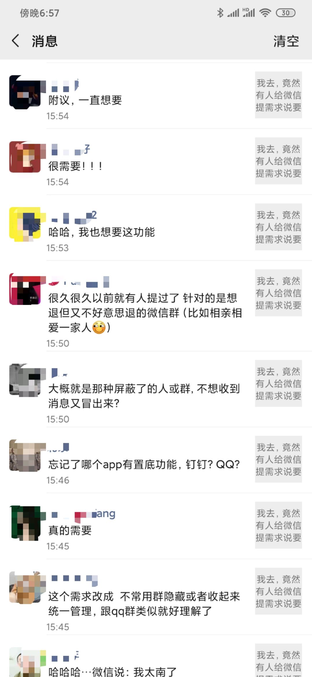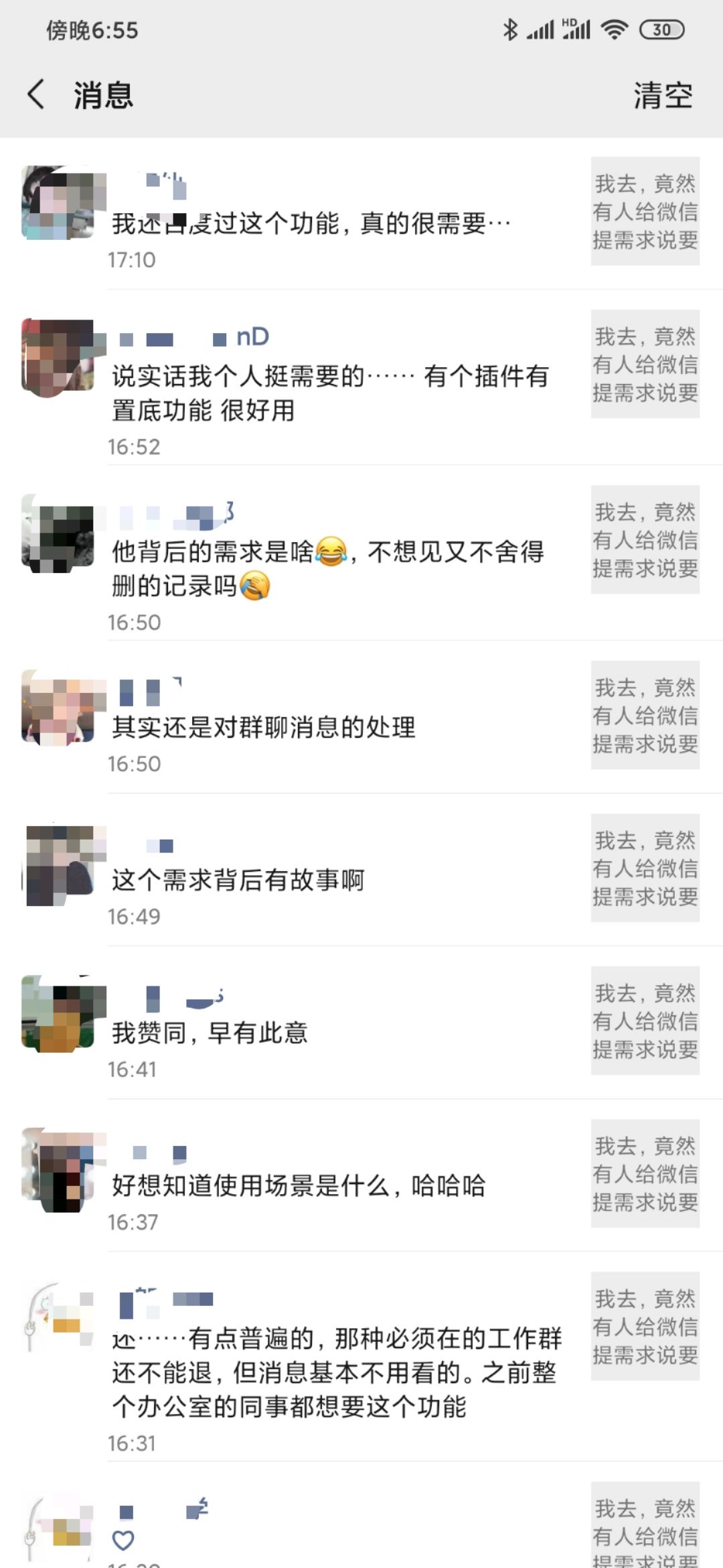 也不知道为啥,朋友圈里一边倒的想要这个「消息置底」的功能。