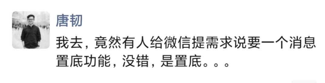 前两天我在一个公众号大佬群里看到一条消息,有个哥们儿给微信提了个需求,说想要一个「消息置底」功能。