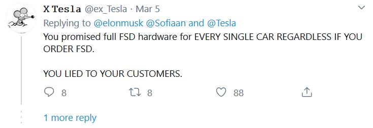 3月5日,一位粉丝在推特上声援特斯拉,称特斯拉交付HW2.5的新车“并不是什么大事”。马斯克随即留言附和,称“那些抱怨的人实际上并没有订购FSD”,暗讽中国消费者“莫名其妙”。此言一出,立刻招致了如潮“反击”。