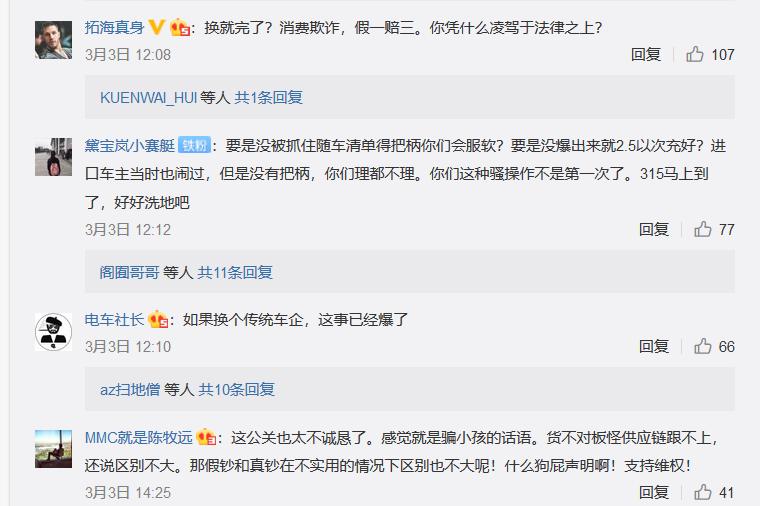 汽车博主“拓海真身”则提出,消费欺诈应该假一赔三,特斯拉“凭什么凌驾于法律之上?”   在特斯拉官方微博发布的“关于中国制造Model 3环评清单问题的说明”下,两条质问能否“假一赔三”的评论获得最高赞数。