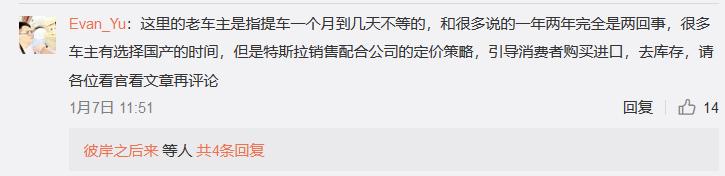 网友“Evan_Yu”指责特斯拉“引导消费者购买进口车,去库存”。网友“追逐幻影不愿梦醒”则认为,这些仅提车几天的车主明明有机会选择国产版本,却“因为特斯拉销售统一制定的策略,(被销售人员的)话术误导选择了价高质次的库存赶工货”。特斯拉并未对此作出回应。