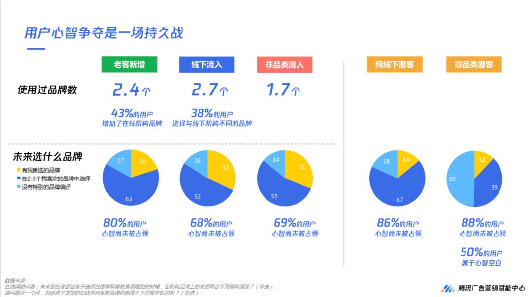目前,在线教育在下沉市场用户的心智认同仍处于较低水平,在线教育品牌仍面临用户群体心智争夺的持久战。报告的数据显示,在问及“未来选什么品牌”时,有首选品牌的用户群体占比不到30%。以二三线城市高占比的全新潜客为例,88%的用户群体心智尚未被占领,50%的用户群体属于心智空白。