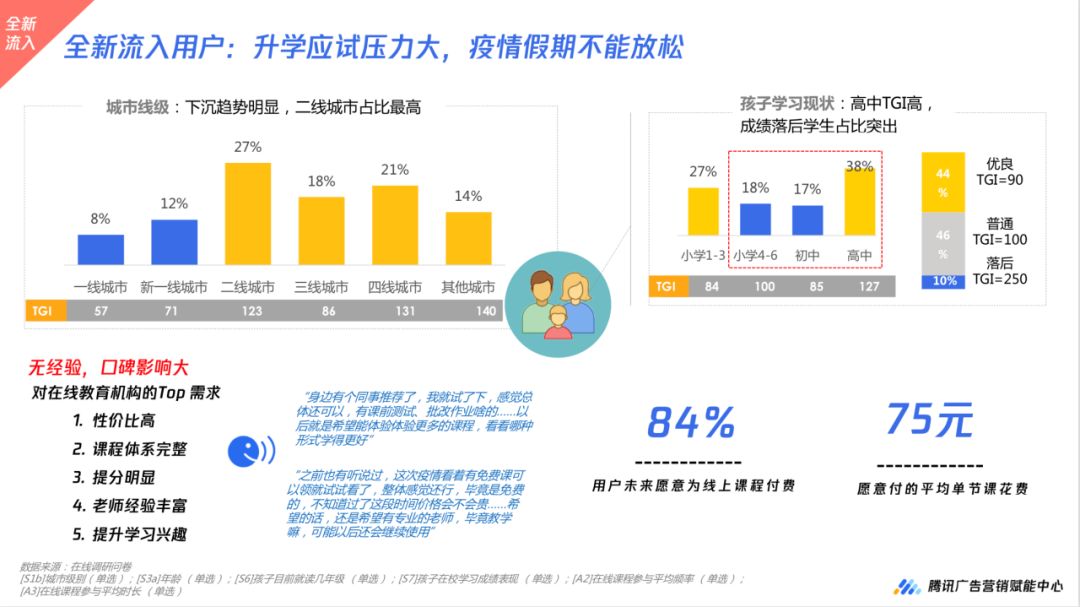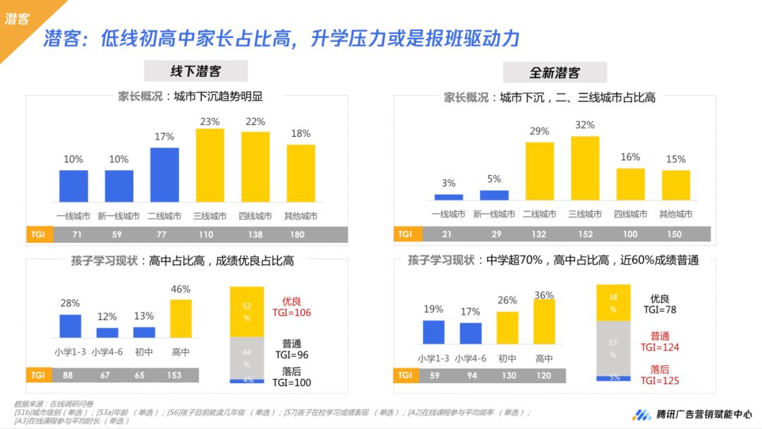 在洞察报告中我们同时了解到,在线教育的大量潜在客户主要集中在二三四线城市中,城市下沉情况明显,并且初高中家长占比高,升学压力或是报班驱动力。对品类的认知不足及效果顾虑阻碍了潜在的家长和孩子去尝试在线教育。