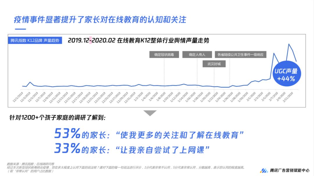 从数据中我们发现,疫情期间直接带动K12在线教育目标人群触达渗透率从37.5%到56.7%,增长50%,另外激活了20%高意愿潜客。在针对1200多个孩子的家庭调研后了解到,53%的家长表示疫情期间使他们更多的关注和了解在线教育,并且有33%的家长亲自尝试了上网课,在整个的体验过程中,重新定义了用户对在线教育的认知。