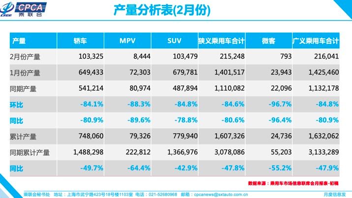 3月9日,乘联会以线上的方式公布了2020年2月我国乘用车市场的销量数据。根据数据显示,2月份,我国狭义乘用车市场销量为25.2万辆,同比下滑了78.5%,环比下滑85.3%。其中,轿车销量124649辆,同比下滑78.4%;SUV销量109938辆,同比下降78.4%;MPV销量17721辆,下滑80.2%。对此,乘联会表示,车市综合销量偏低是春节提早的季节性影响及疫情冲击的综合影响。