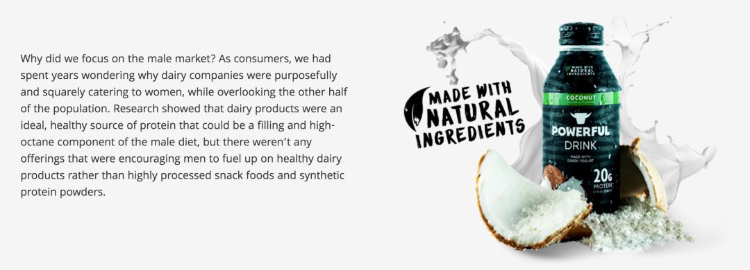 当时Powerful团队认为Muscle Milk产品的配料表过于复杂难懂,还有很多不天然的人工成分,因此“不够健康“。所以某种程度来看,Powerful是在男性群体在健康、天然的消费趋势下,对好的高蛋白、积极生活方式类的食品选择相对匮乏,因而塑造的一个差异化产品。