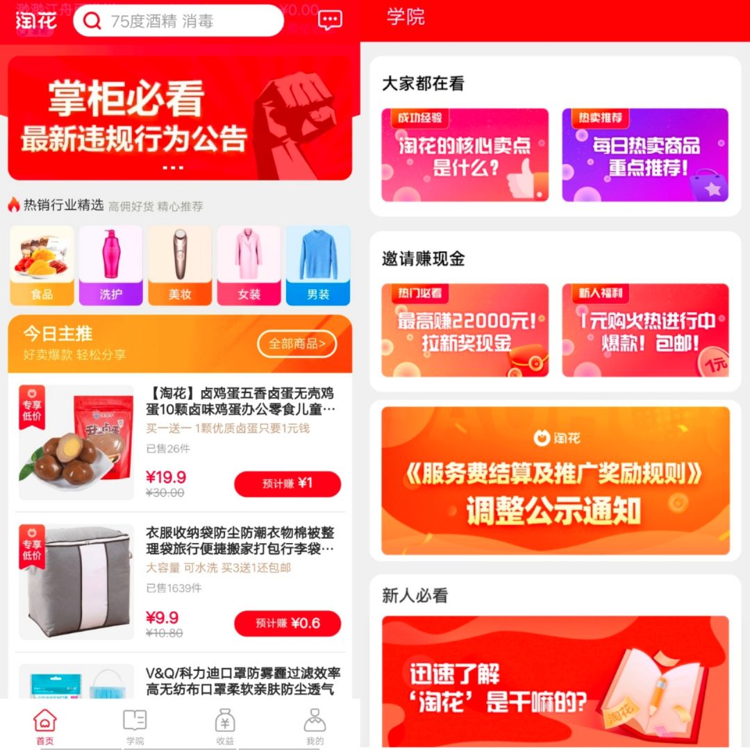 移动端的“淘花”分为“商品首页”、“学院”、“收益”、“个人中心”等4个功能模块。用户需要通过邀请码才能完成注册登录,并成为新的掌柜。