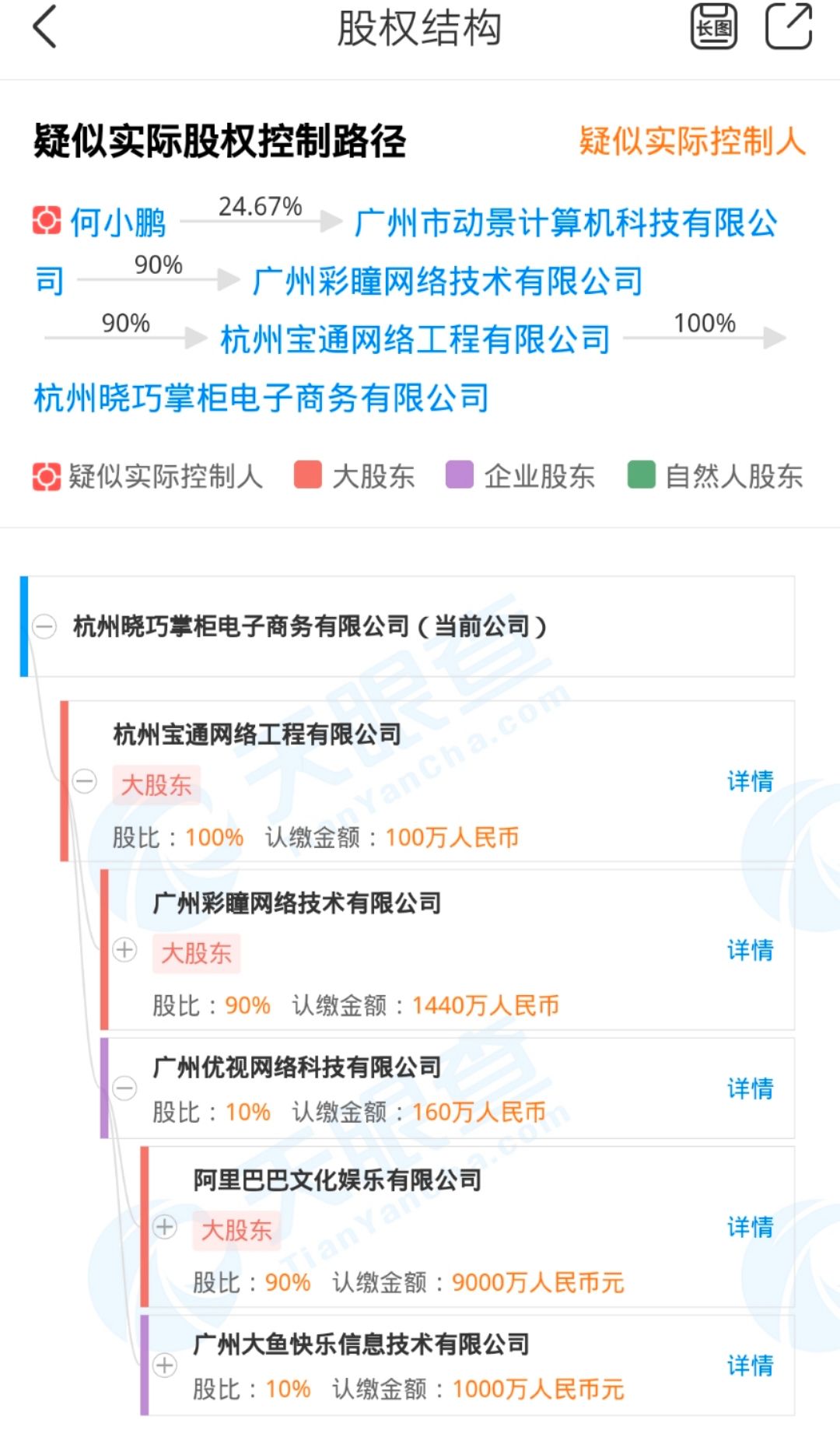据天眼查查询可知,“淘花”的开发者为杭州晓巧掌柜电子商务有限公司,疑似实际股权控制方是阿里巴巴文化娱乐有限公司。