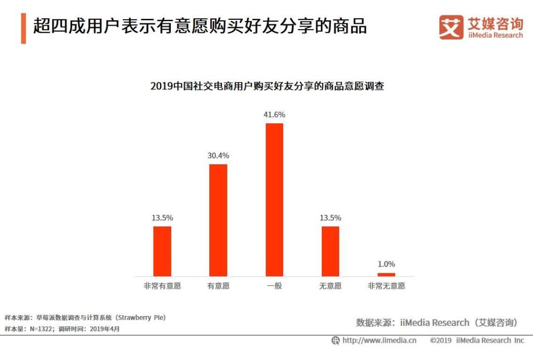 社交电商正在成为一种新的趋势,根据艾媒咨询的《2019-2020中国社交电商行业用户规模及用户调查》可知,有超四成用户是有意愿购买好友分享的商品。由于社交电商的商品,一般具有其低价格优势,用户会更加愿意在平台上进行购买。
