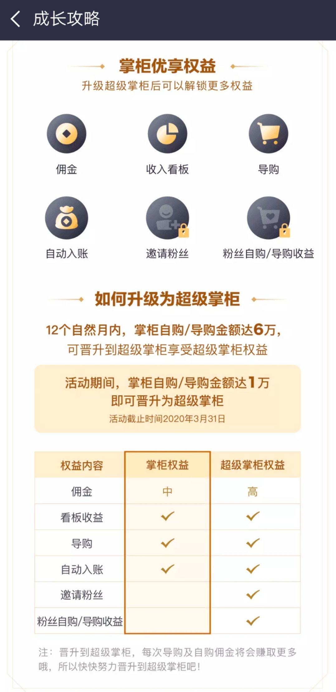 掌柜分两个等级,即掌柜和超级掌柜,其规则是在规定期限内累积一定金额,即可成为超级掌柜,这一点与阿里淘宝旗下的首款社交电商平台,“淘小铺”的晋升规则类似。作为超级掌柜,就能拥有邀请码特权,通过邀请一大批新的掌柜,可以从这些新掌柜的订单金额中抽取部分佣金。普通的掌柜只能分享商品链接给他人,他人买了商品并成交后才能获取佣金。