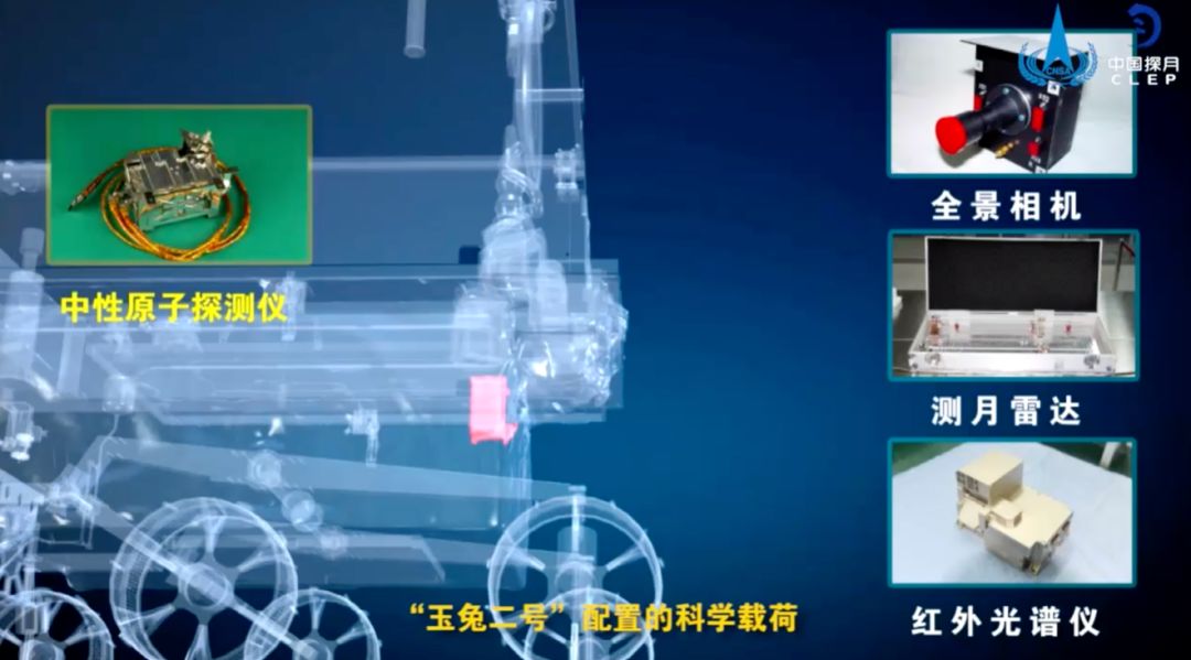 玉兔二号上配置的科学载荷主要包括全景相机、测月雷达、红外光谱仪、中性原子探测仪。这些载荷用于月球地质探测、宇宙天文科学等领域的科学研究。