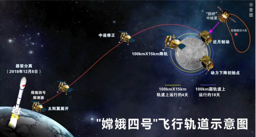 那么接下来几天,可以看这个轨道的图,是经过了几次的轨道修正,到达月球附近之后进行近月制动、环月降轨。在2019年1月3号进入了一个动力下降的过程,开始着陆。