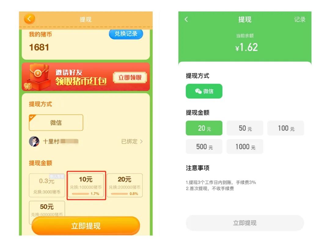 比如某养猪游戏,100000猪币=10块钱,而每次看广告、升级等只能得到1、2分钱。