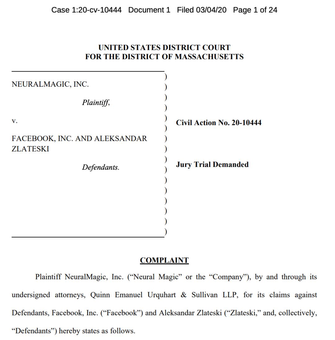 上周,创业公司 Neural Magic 在波士顿地方法院,将 Facebook 告上法庭,称其窃取并公开 Neural Magic 核心的专有算法技术和知识产权。