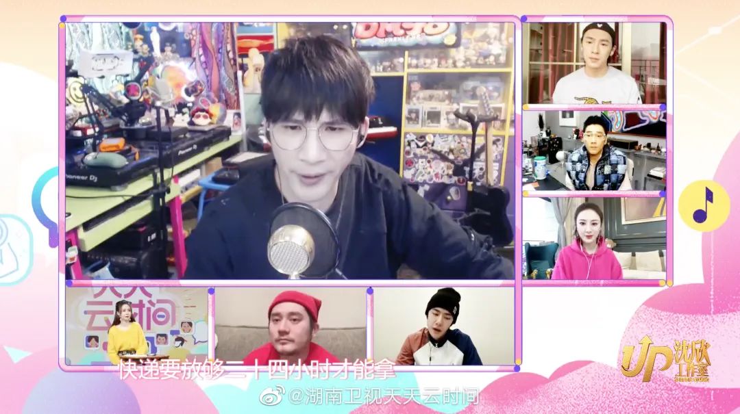同一天,隔壁的《天天向上》团队也在30小时之内,完成了《天天云时间》的录制和播出。比起“一对一连线”的《嘿!你在干嘛呢》,《天天云时间》采用的是“多人连线”的方式。每一期节目中,主持人会与多位明星连麦,探讨一个与宅家相关的主题,或是运动,或是护肤,或是安利影视剧。