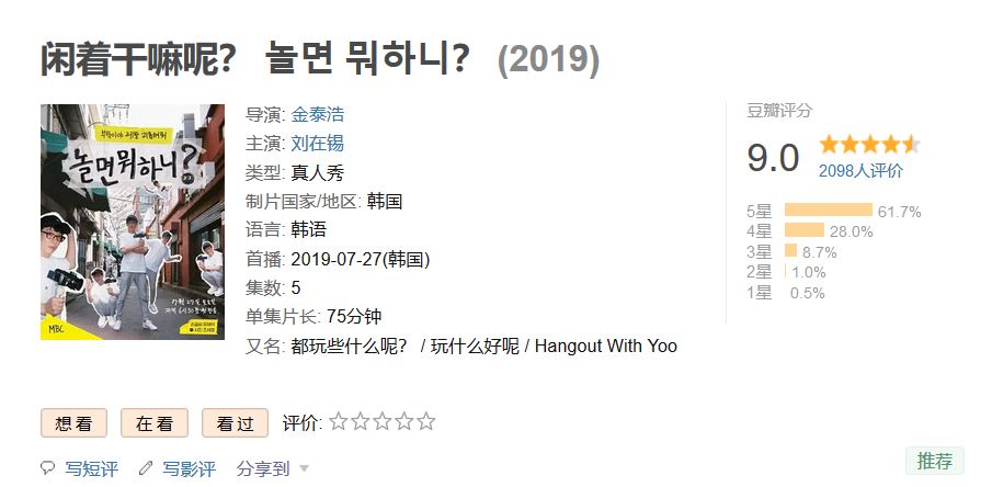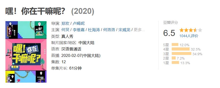 截止3月10日,“宅综艺”中唯一在豆瓣开分的,是制作团队操作相对成熟,主持人较为专业的《嘿,你在干嘛呢?》,评分为6.5分。