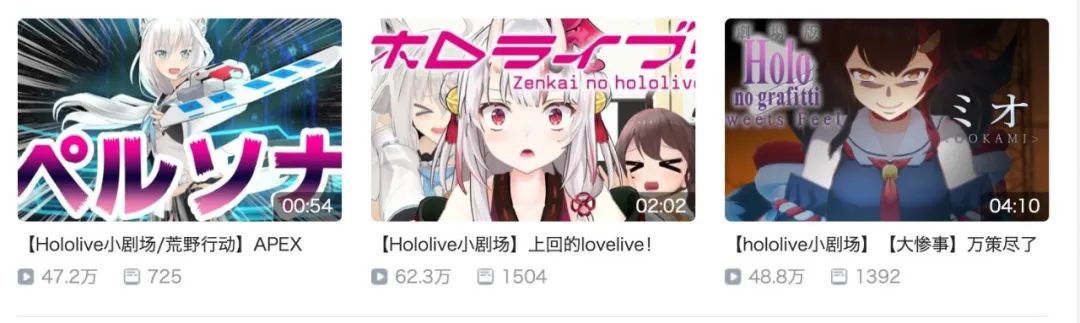 hololive小剧场参照日本漫才短剧,制作3D搞笑动画,讲述虚拟主播有趣的互动日常,目前已推出“女高中生成为了内阁官房长官”、“养○○的结果”、“你可知人肉俄罗斯方块?”等将近50部小剧场。小剧场的剧情丰富,打破语言和文化壁垒,为虚拟主播赋予更完整的人设和世界观,其官方同人的性质加强虚拟主播间的联系,打通主播间的粉丝圈。