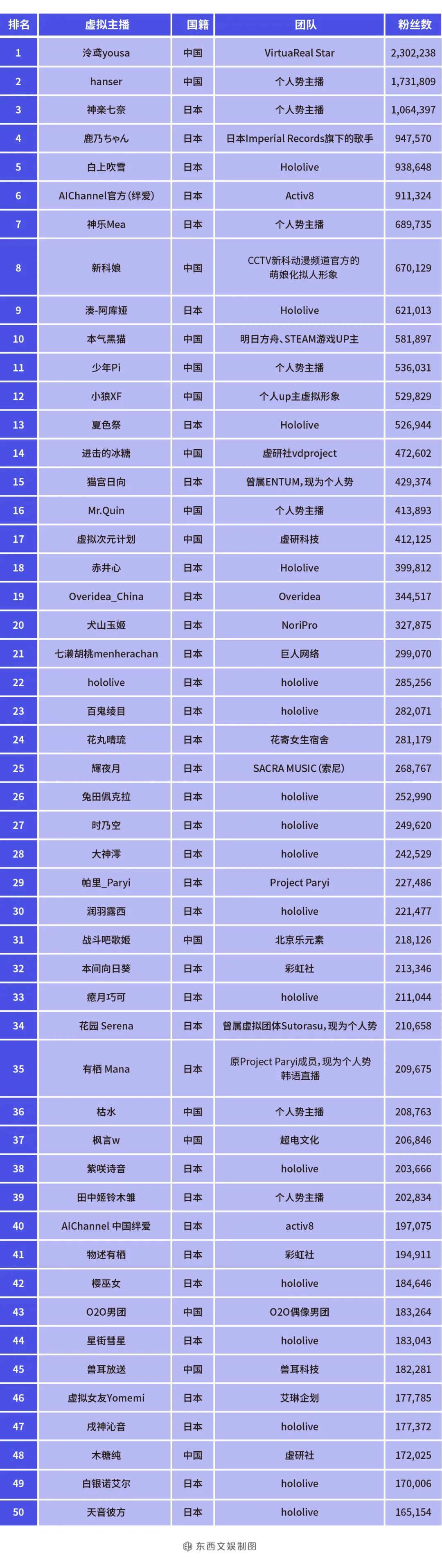 另外,通过对B站虚拟主播排名前五十名的数据梳理来看(截止3月11日17:30),目前hololive旗下的虚拟主播整体榜单成绩突出,当然,这也跟 hololive偶像系的路线设定有关系。