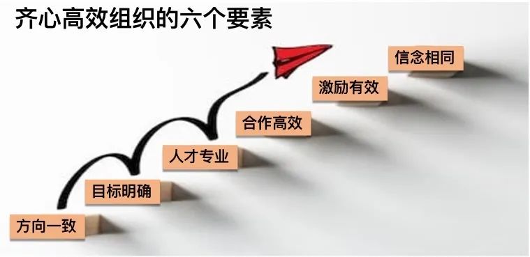 齐心高效的组织需具备六大要素,即方向一致、目标明确、人才专业、合作高效、激励有效、信念相同。