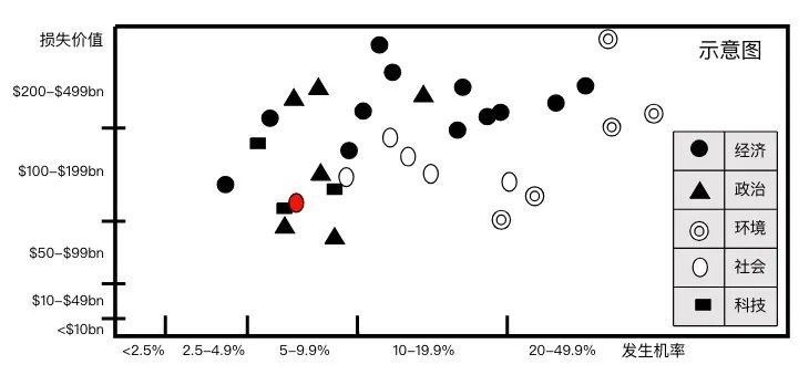 最近看到一篇材料,是澳洲做的国家风险地图。从图里可以看到,在未来十年里,各种潜在风险事件发生的概率,以及可能带来的损失价值。