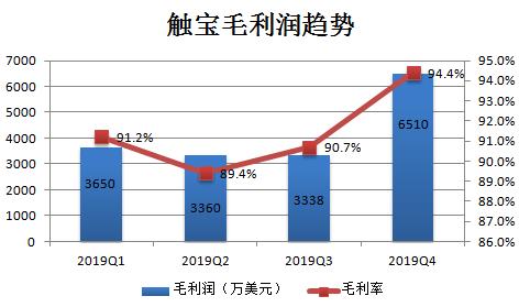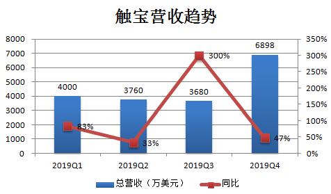 北京时间3月12日,触宝(CTK.US)发布了截至2019年12月31日的第四季度及全年财务报告。财报显示,触宝2019年第四季度的营收为6898万美元,同比增长47%,比触宝上季度调整后的指导预期5300万美元高出30%,比彭博一致预期高2238万美元;该季度毛利润为6510万美元,同比增长49%;毛利率在彭博一致预期之内,为94.4%,同比增长1.8%。全年营收为1.77亿美元,同比增长33%;毛利润为1.63亿美元,同比增长36%。