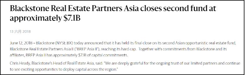 黑石于2018年成功募集第二只亚洲机会型房地产基金(BREP Asia II),募资总额高达 71亿美元