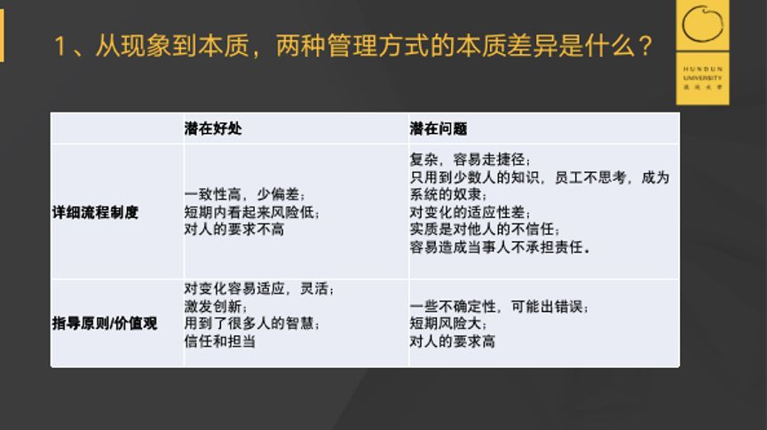 但是它潜在的问题是,首先流程很复杂,很多员工不愿意做,就会走捷径。其次流程制定得太细,员工不思考,成为系统的奴隶。第三对变化的适应性差,容易形成官僚思维。最后,流程本质上是对他人的不信任,员工成了机器人,责任感低。