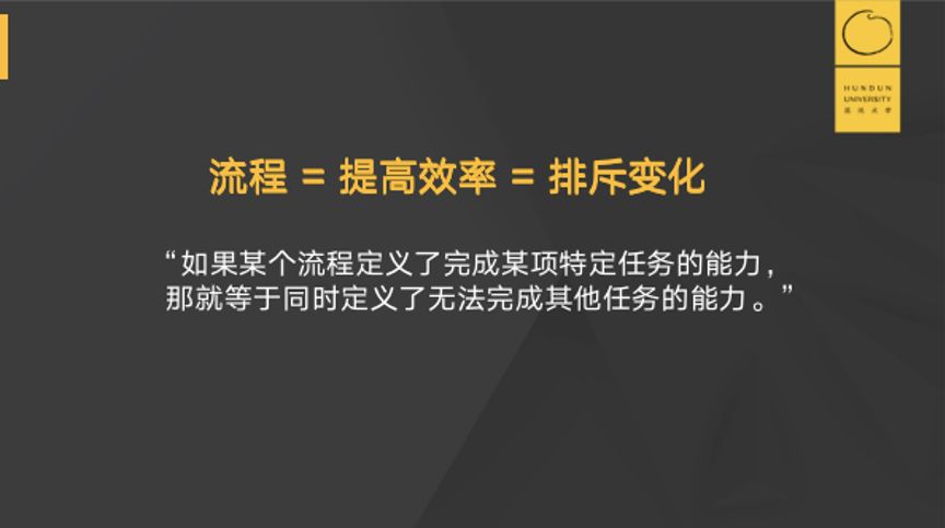 但是问题随之而来。流程意味着提高了效率,但是排斥了变化。用流程定义了某项特定任务的能力,同时也就定义了他无法完成其他任务的能力。企业的创新也就死的更多一些。