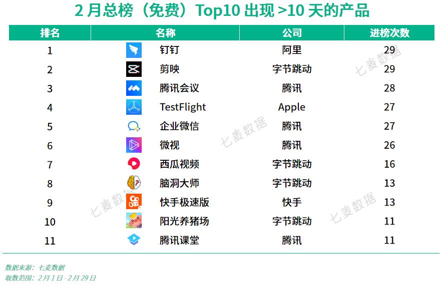 七麦数据此次选取 2 月总榜(免费)Top10 的上榜产品进行分析,其中,在总榜(免费)Top10 中出现 >10 天的产品共计 11 款,其中,钉钉、剪映、腾讯会议、TestFlight、企业微信、微视 6 款产品表现极为突出,当月累计在榜超 20 天。