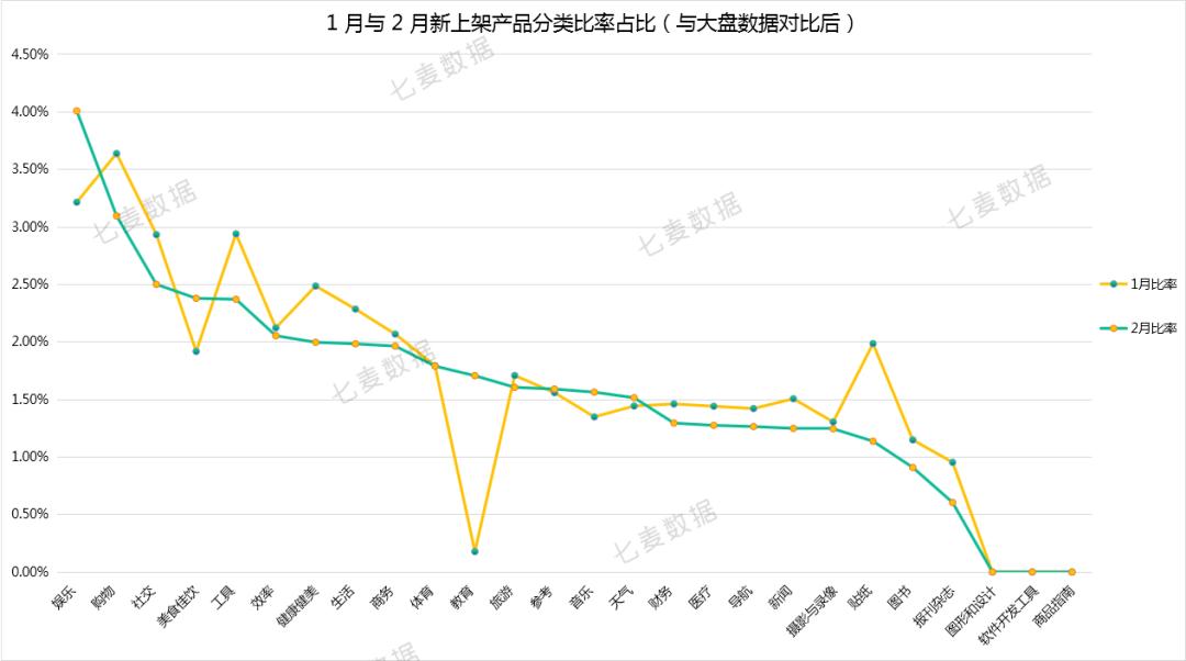七麦数据此次将 2 月的新上架产品与 App Store 目前的在架产品大盘数据进行比率计算,并与 1 月的比率结果进行对比后发现,娱乐、美食佳饮、教育类产品有着比较明显的增长。