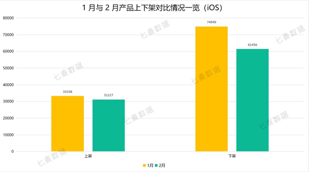 七麦数据此次针对 2 月的产品上下架情况进行分析,可以发现,今年 2 月的新上架产品数量与 1 月相比出现了小幅下降的变化,而被下架产品的数量却出现了较大的下降趋势。