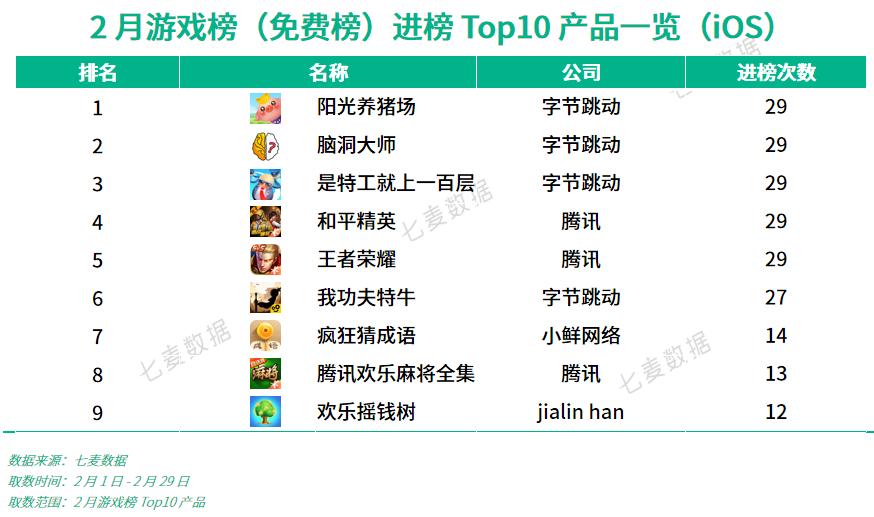 休闲游戏开始受到用户的欢迎已经是近年来游戏行业的共识,在 2 月空闲时间大幅增长的情况下,依然是休闲游戏占据了游戏榜的大部分权重,而在此次进入总榜 Top10 的 9 款游戏中,就有阳光养猪场、疯狂猜成语、欢乐摇钱树 3 款产品均为网赚类游戏。