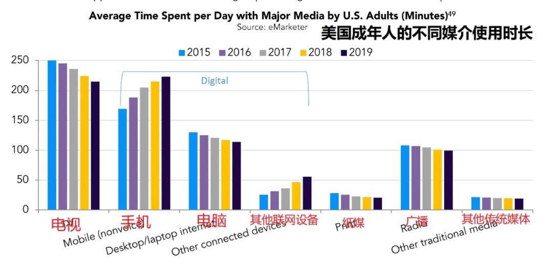 现在美国人每天使用智能手机的时间达到了3小时43分钟,而他们花在电视机上的时间是3小时34分钟。这是智能手机首次超过电视机。另一个值得关注的是“其他联网设备”,在2019年取得了20%的增长,这个分类将Apple TV 和 Roku这样的联网机顶盒给算了进去。