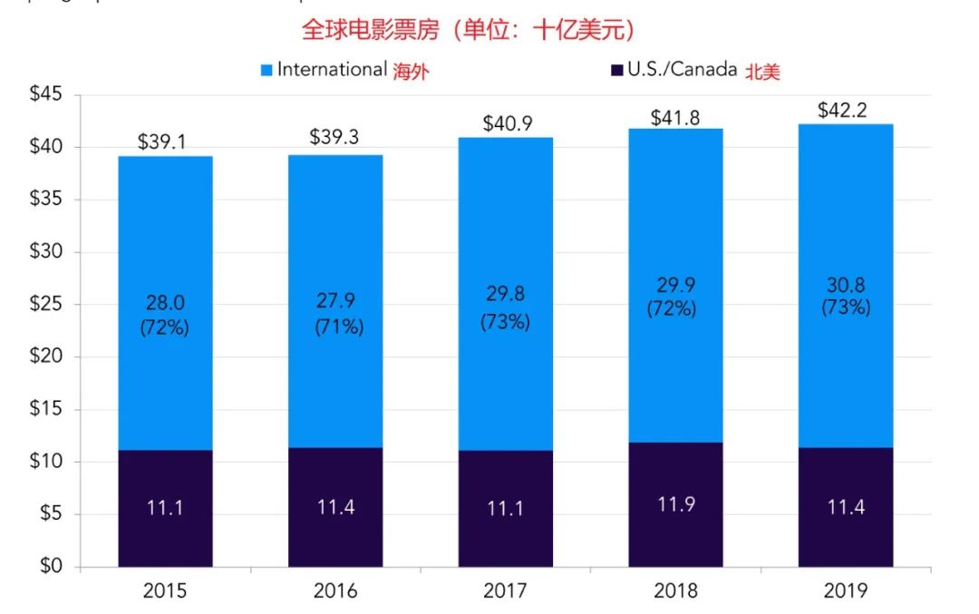 《报告》显示,2019年全球电影票房422亿美元,较2018年上升了1%。而全球家庭娱乐市场(包括流媒体、电视、DVD)的市场规模达到了588亿美元,较2018年增长了14%。这两个数字相加,意味着全球内容市场的消费规模达到了千亿美元的量级。