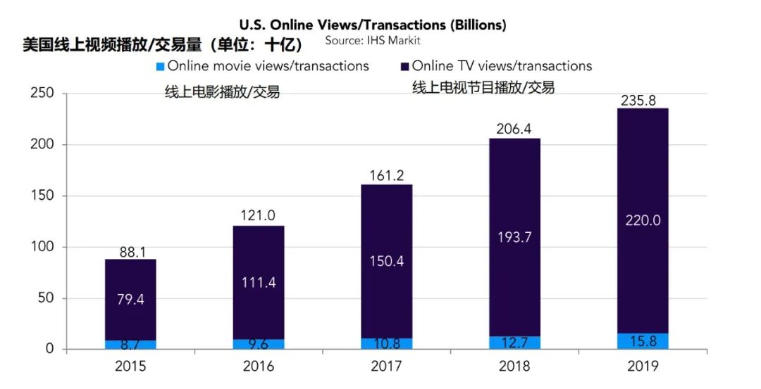 在美国,流媒体上电视剧的播放量在2019年上升了14%,达到了2200亿次,而电影的播放量上升了25%,有大约158亿次。这个数字相较于电视剧很低,但依旧比大家去院线的频率高——上文我们提到了,2019年美国售出的电影票数只有电影12.4亿张。