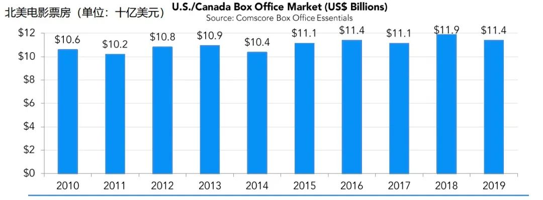 院线市场的增速在放缓,甚至像美国这样发达市场已经出现了事实上的大幅下滑。根据《报告》,2019年美国电影总票房114亿美元,较前一年下滑4%,售出电影票12.4亿张,下滑5%。