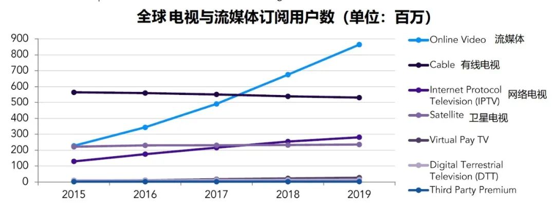 《报告》显示,虽然2019年出现订阅人数的下滑,但全球有线电视市场规模达到了1160亿美元,相较前一年增长了22亿美元,而全球流媒体的市场规模虽然在2019年经历了31%的大幅增长,但仍只有448亿美元,只有有线电视的一半不到。