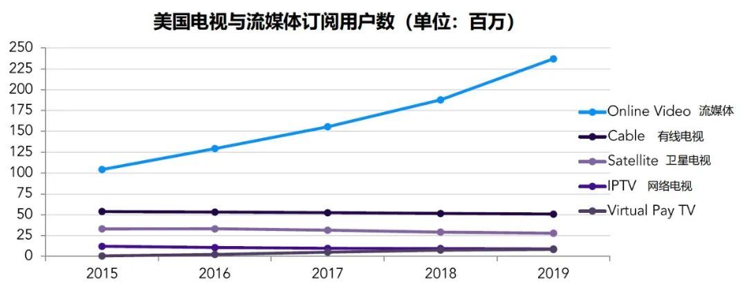 目前,美国的大大小小的影视公司和电视网都在向流媒体转型,包括拥有HBO的华纳,都要推出流媒体平台HBO Max以应对市场变化。现在,向美国观众提供流媒体服务的平台有超过140家。结合历史数据,有线电视的用户数量已经进入下滑轨道,有线电视被取代只是时间问题。