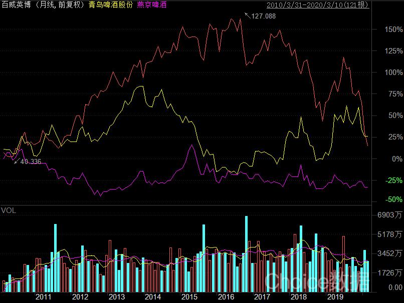 无论是世界啤酒巨头百威英博,还是中国强势本土品牌青岛啤酒和燕京啤酒,它们股价最终落脚点都惊人的相似:当消费市场的需求饱和后,股价便趴在了地板上。
