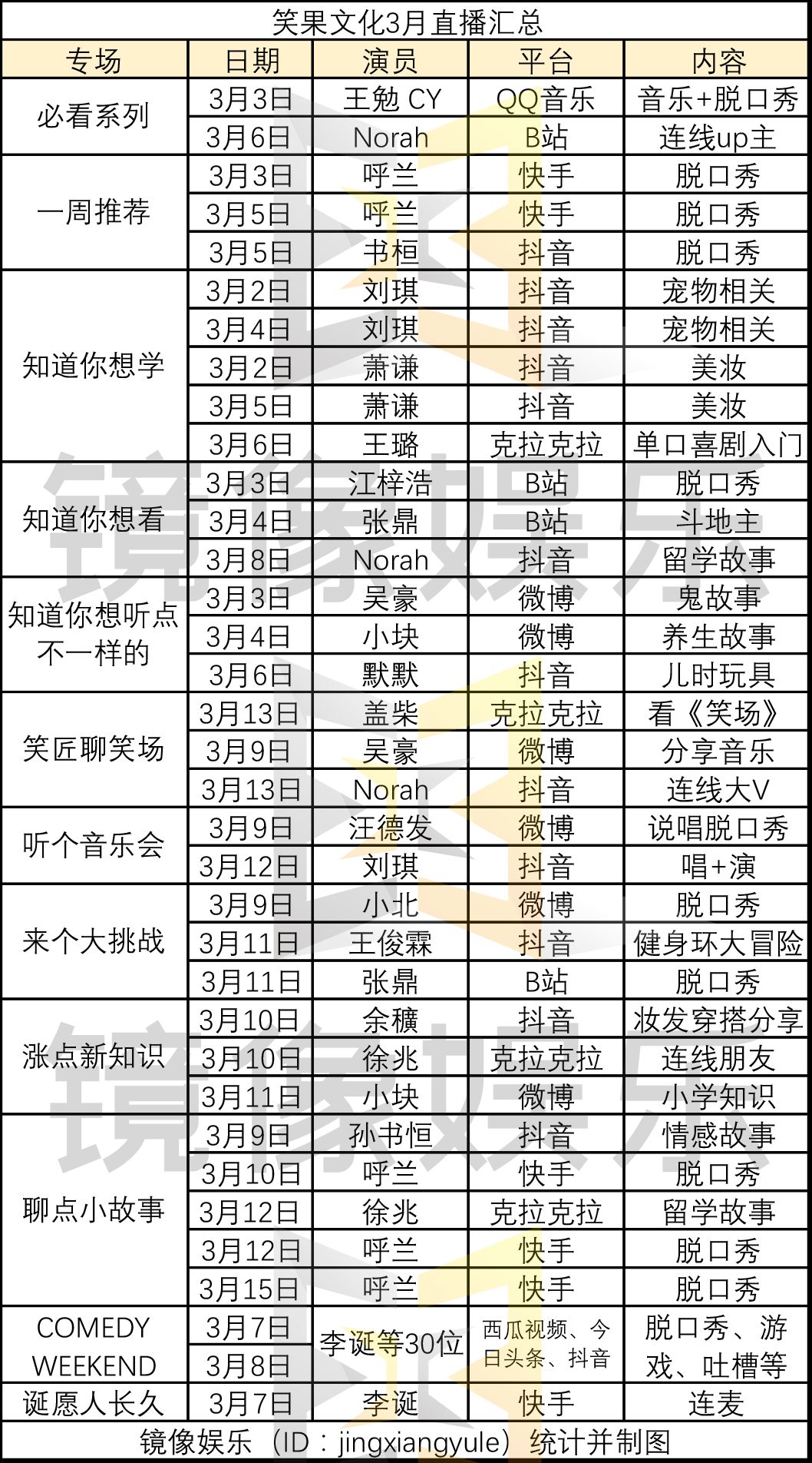 据镜像娱乐统计,3月以来,笑果文化旗下脱口秀演员已有35场直播,覆盖B站、快手、抖音、今日头条等长、短视频平台,以QQ音乐为代表的音乐平台、以克拉克拉为代表的直播平台。每位脱口秀演员一周直播1~2次,李诞、呼兰这样的知名脱口秀演员频次更高。